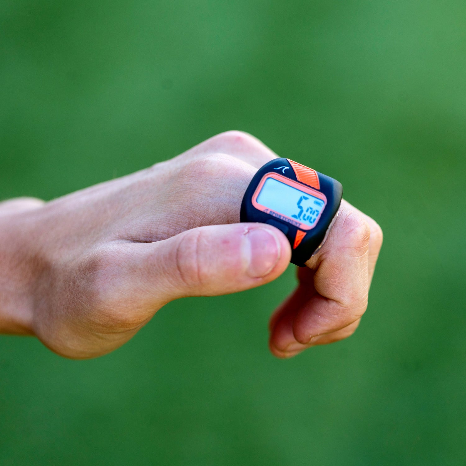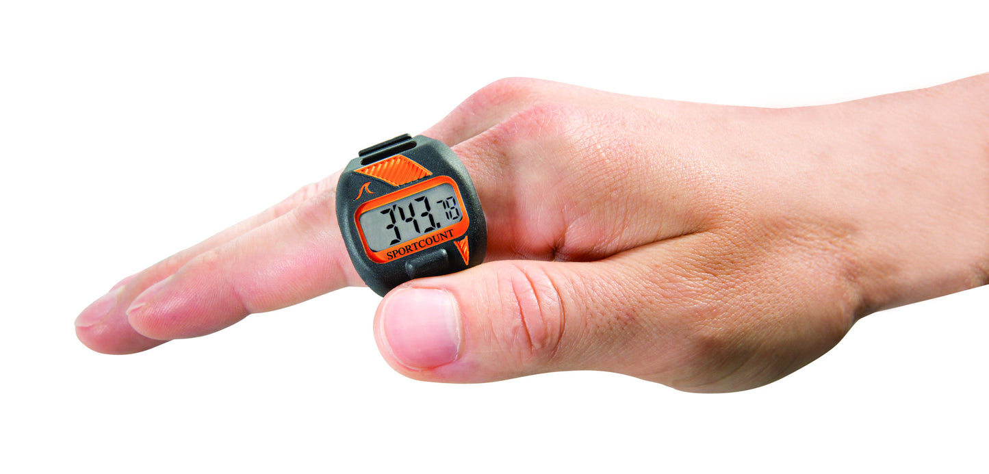 Each SportCount model fits comfortably on your index finger like a ring. The adjustable strap allows each device to fit any finger size. Just press the button with your thumb — it’s designed for one-handed use while swimming, running, or training.