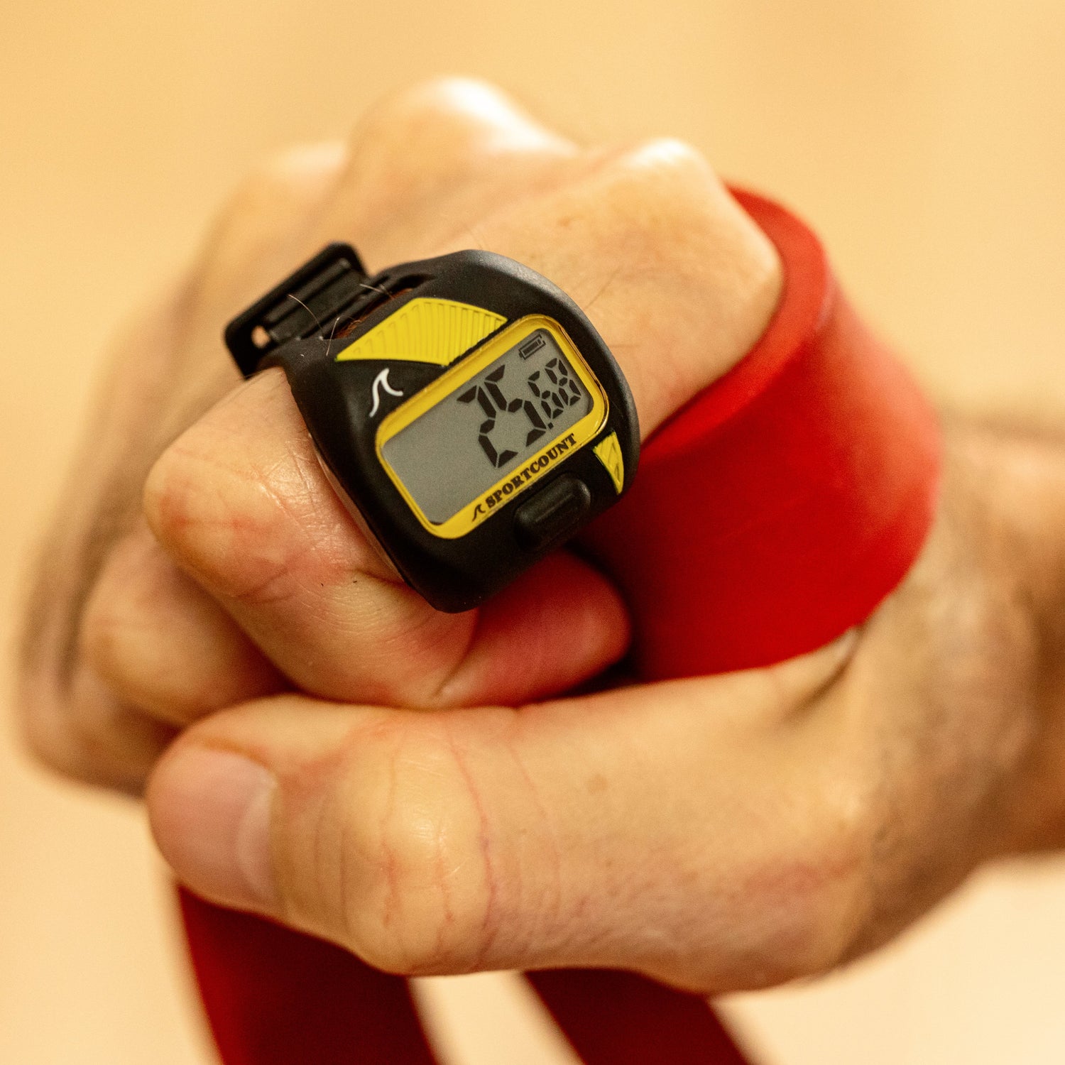 Slide the SportCount onto your finger like a ring. It’s ultra-light and water-resistant, so you’ll forget it’s even there.